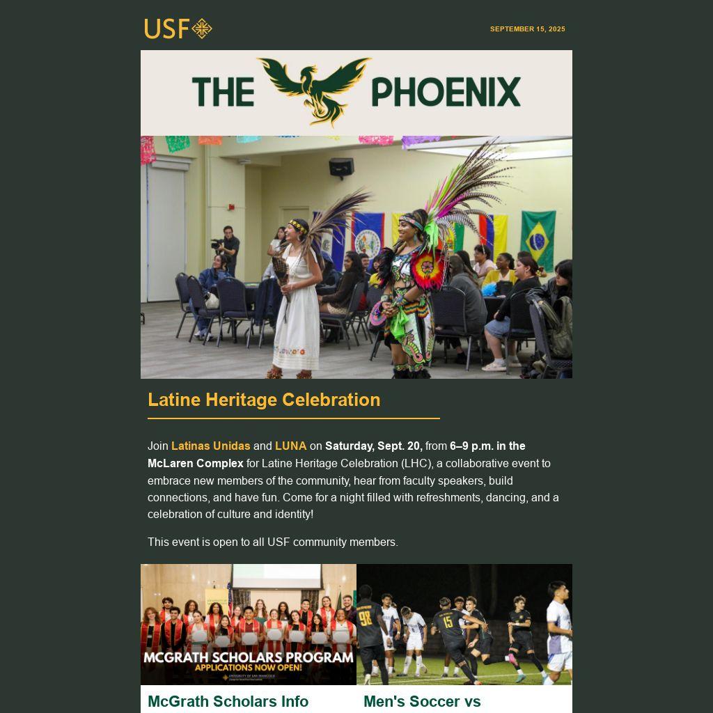 The Phoenix is a weekly e-newsletter sent by Student Leadership and Engagement to help students stay connected and get involved. It features campus events, leadership opportunities, athletic games, workshops, retreats, and more. Why “The Phoenix” title? The Phoenix has long been associated with the history and growth of USF as well as St. Ignatius, who encouraged followers to “go forth and set the world on fire.” Learn more »