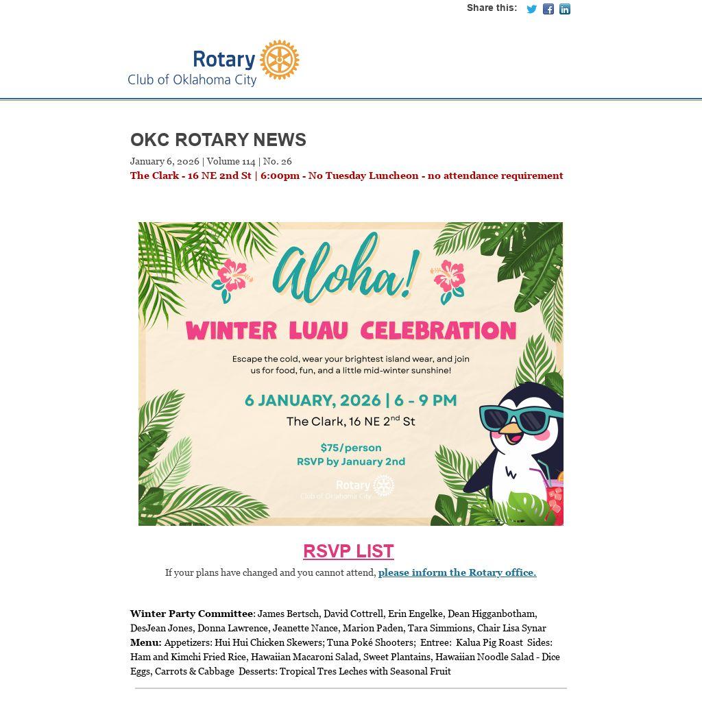January 6, 2026 - Rotary Winter Party January 31, 2026 - Pickleball Tournament February 10, 2026 - Rotary Afterhours