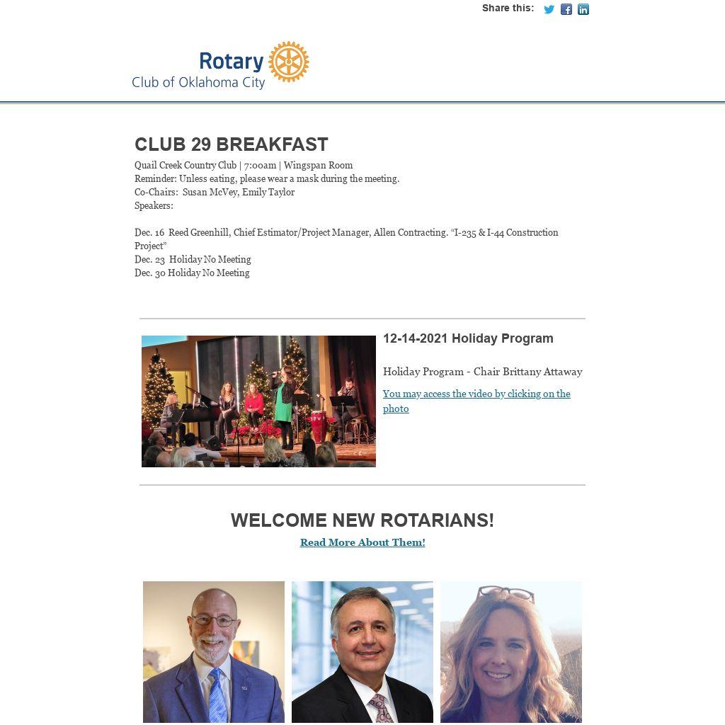 Rotary Club 29 has an online membership directory which contains current content information for all club members. The link to access the Club 29 directory can be found at the top of the home page of okcrotary.club or by clicking here.