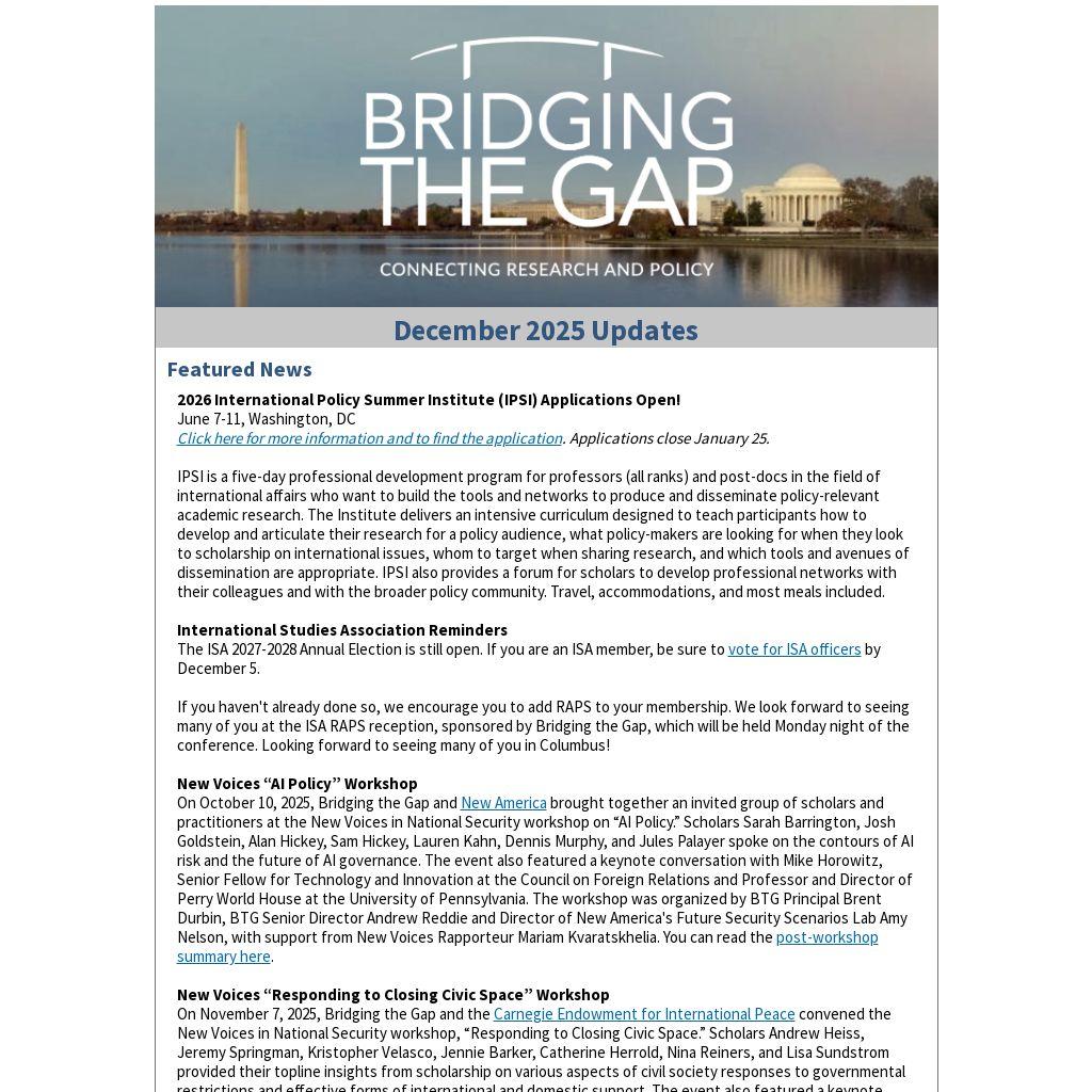 On November 7, 2025, Bridging the Gap and the Carnegie Endowment for International Peace convened the New Voices in National Security workshop, “Responding to Closing Civic Space.” Scholars Andrew Heiss, Jeremy Springman, Kristopher Velasco, Jennie Barker, Catherine Herrold, Nina Reiners, and Lisa Sundstrom provided their topline insights from scholarship on various aspects of civil society responses to governmental restrictions and effective forms of international and domestic support. The event also featured a keynote conversation with Shannon Green, CEO & President of Philanthropy for Active Civic Engagement (PACE) and former Assistant to the Administrator of the Bureau for Democracy, Human Rights, and Governance at USAID. The workshop was convened by BTG Director Suparna Chaudhry and CEIP Senior Fellow Saskia Brechenmacher, with support from New Voices Rapporteurs Daniela Rivas Clavel and Shreya Joshi.
