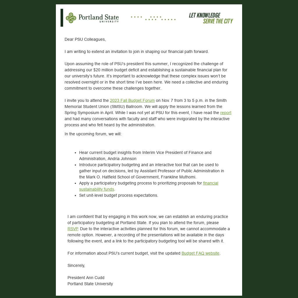 I invite you to attend the 2023 Fall Budget Forum on Nov. 7 from 3 to 5 p.m. in the Smith Memorial Student Union (SMSU) Ballroom. We will apply the lessons learned from the Spring Symposium in April. While I was not yet at PSU for this event, I have read the report and had many conversations with faculty and staff who were invigorated by the interactive process and who felt heard by the administration.