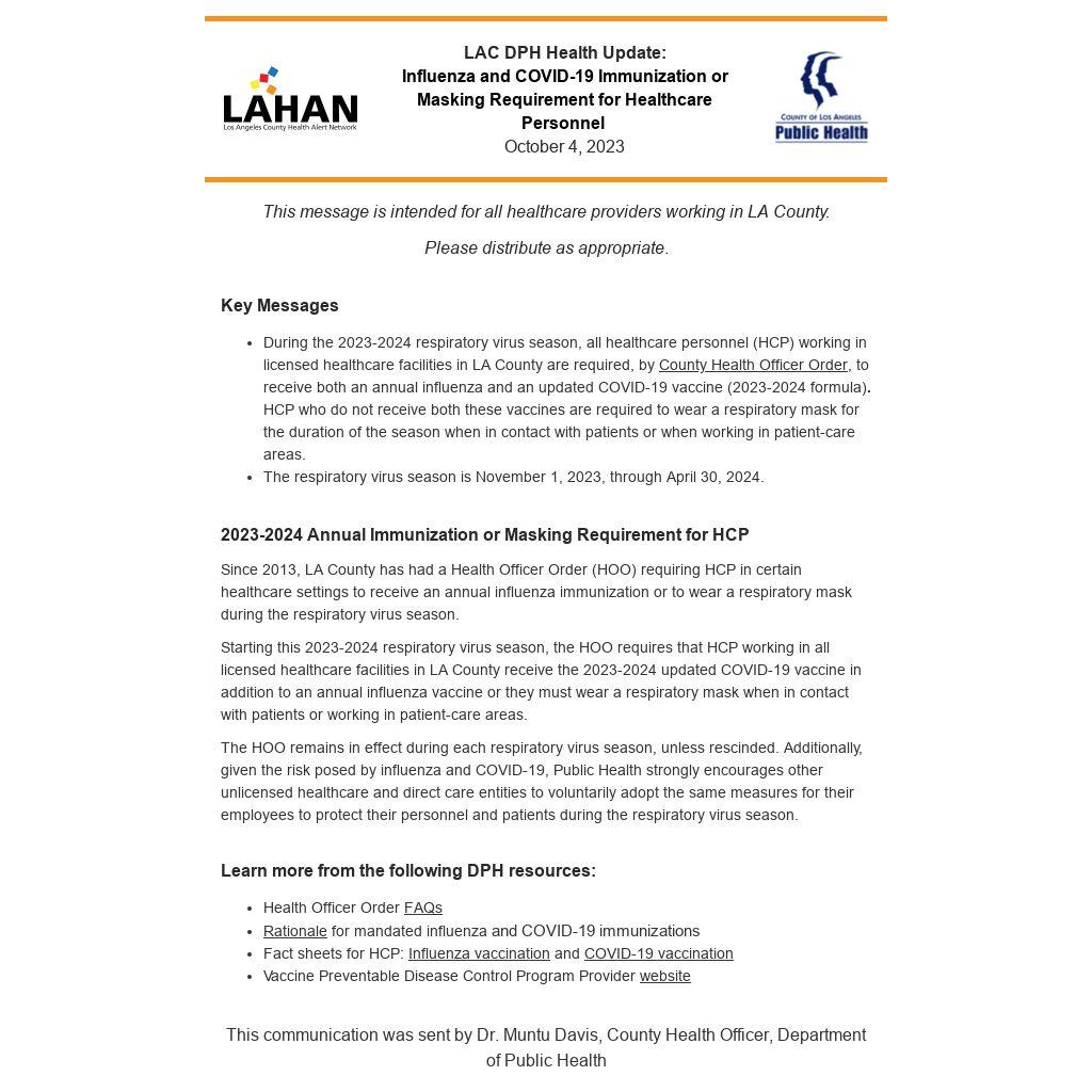 Starting this 2023-2024 respiratory virus season, the HOO requires that HCP working in all licensed healthcare facilities in LA County receive the 2023-2024 updated COVID-19 vaccine in addition to an annual influenza vaccine or they must wear a respiratory mask when in contact with patients or working in patient-care areas.