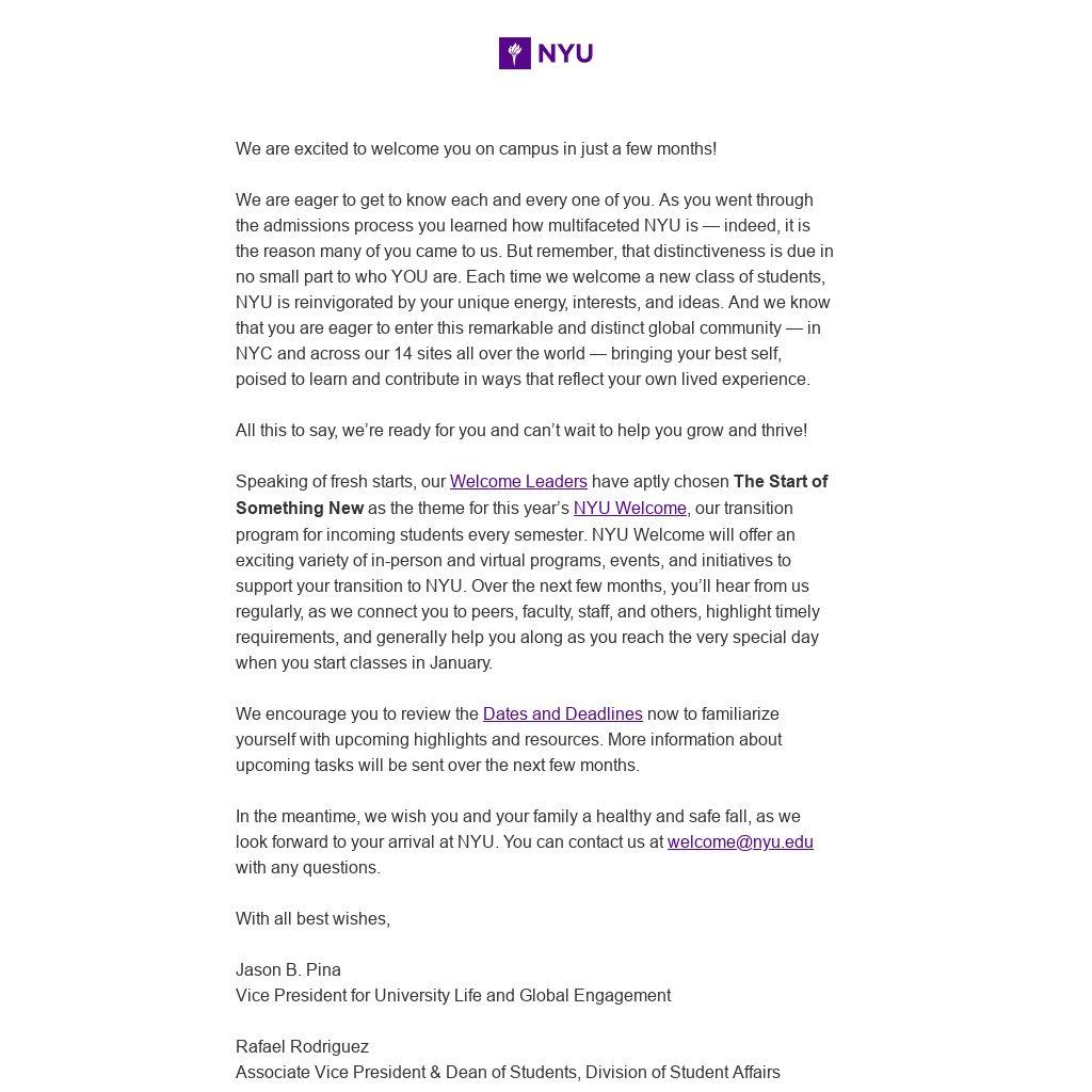 In the meantime, we wish you and your family a healthy and safe fall, as we look forward to your arrival at NYU. You can contact us at