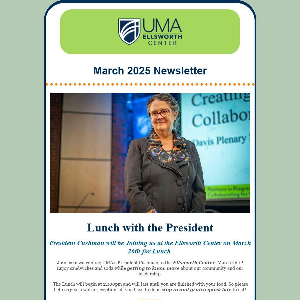 Join us in welcoming UMA's President Cushman to the Ellsworth Center, March 26th! Enjoy sandwiches and soda while getting to know more about our community and our leadership.