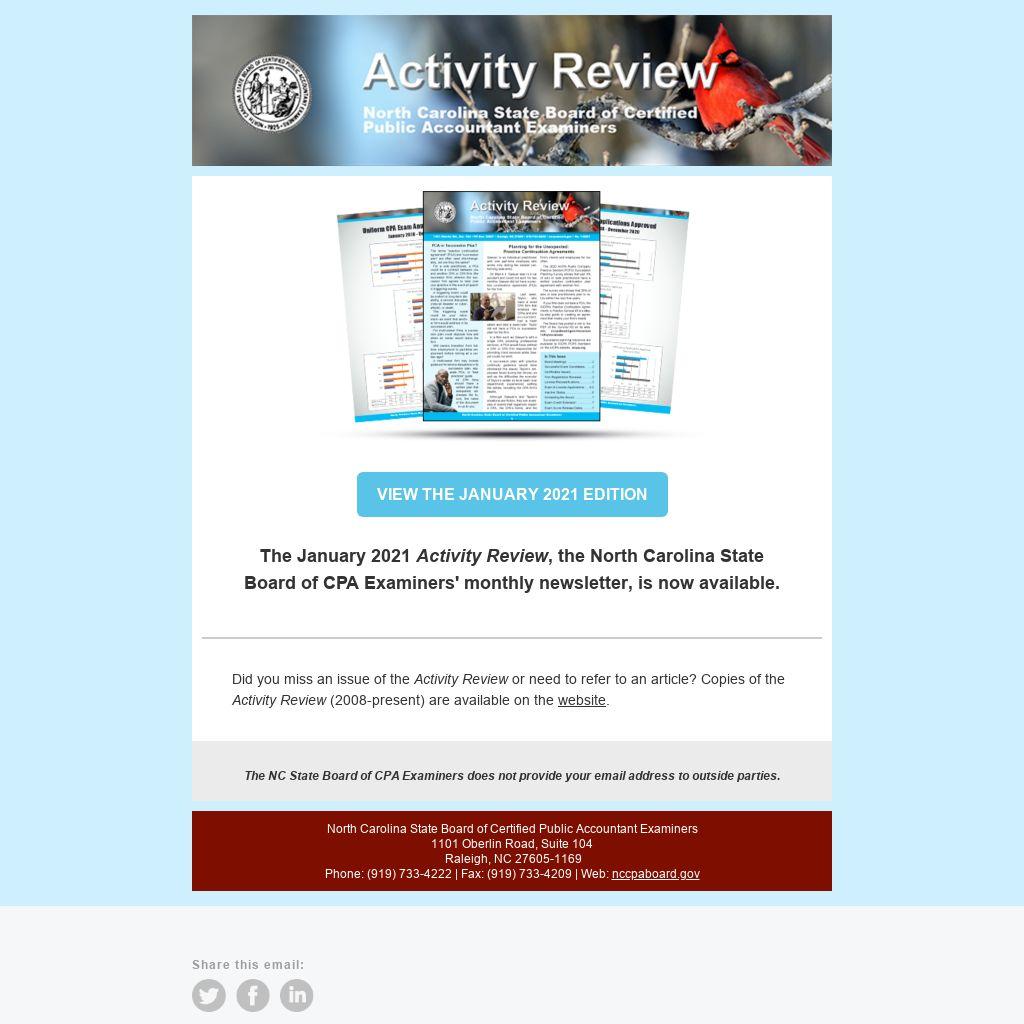 The January 2021 Activity Review, the North Carolina State Board of CPA Examiners' monthly newsletter, is now available.