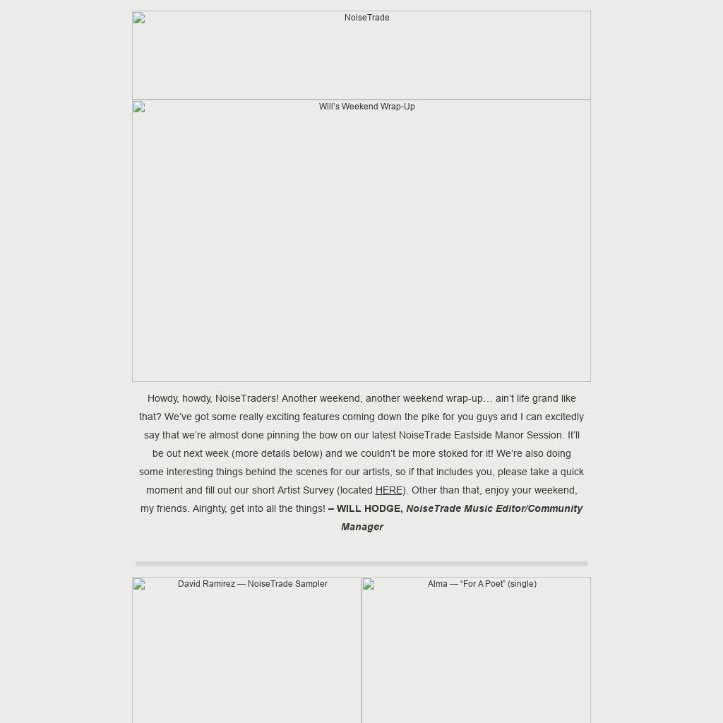 Howdy, howdy, NoiseTraders! Another weekend, another weekend wrap-up… ain’t life grand like that? We’ve got some really exciting features coming down the pike for you guys and I can excitedly say that we’re almost done pinning the bow on our latest NoiseTrade Eastside Manor Session. It’ll be out next week (more details below) and we couldn’t be more stoked for it! We’re also doing some interesting things behind the scenes for our artists, so if that includes you, please take a quick moment and fill out our short Artist Survey (located HERE). Other than that, enjoy your weekend, my friends. Alrighty, get into all the things! – WILL HODGE, NoiseTrade Music Editor/Community Manager