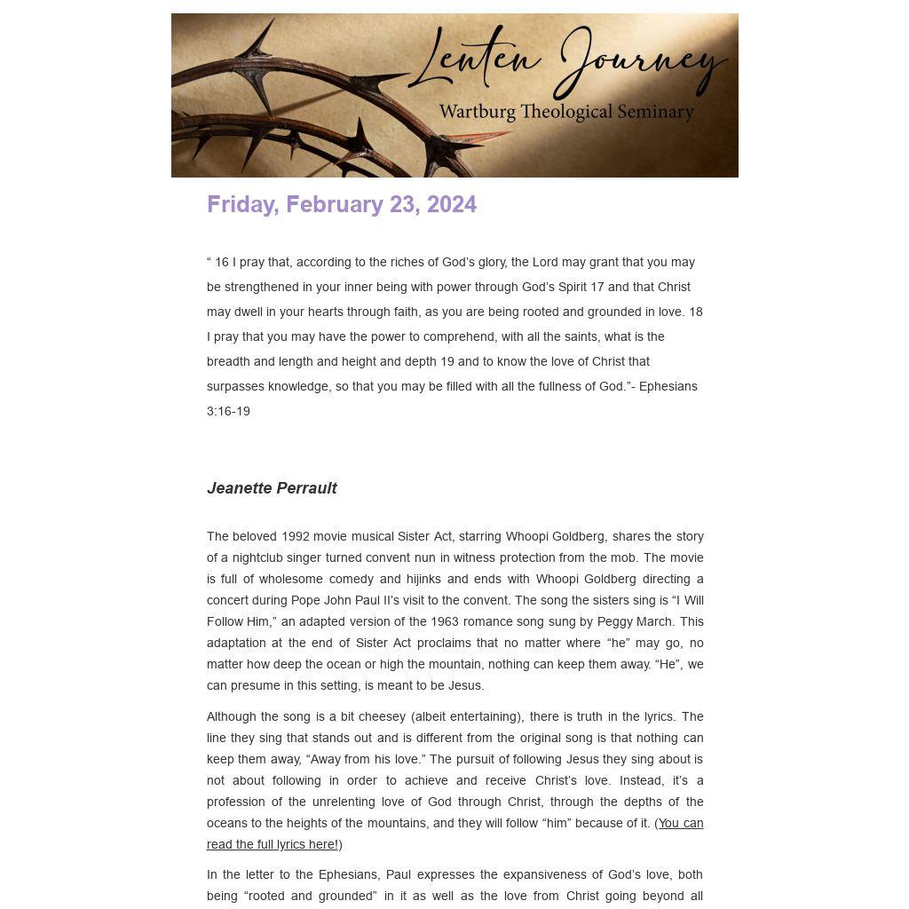 In the letter to the Ephesians, Paul expresses the expansiveness of God’s love, both being “rooted and grounded” in it as well as the love from Christ going beyond all knowledge and understanding. It’s not easy to follow Jesus, and most often it doesn’t make much sense. But when we have the love of God that grounds us, pursues us, and never leaves us, and was given through the life, death, and resurrection of Jesus, placing our trust in Christ and following him becomes the way forward. As both Paul and Whoopi Goldberg say, nothing can keep us away from Christ’s love.