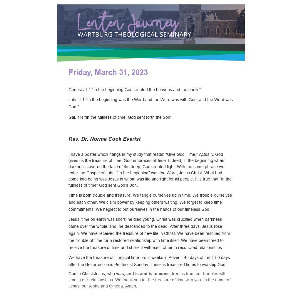 Jesus’ time on earth was short; he died young. Christ was crucified when darkness came over the whole land; he descended to the dead. After three days, Jesus rose again. We have received the treasure of new life in Christ. We have been rescued from the trouble of time for a restored relationship with time itself. We have been freed to receive the treasure of time and share it with each other in reconciled relationships.