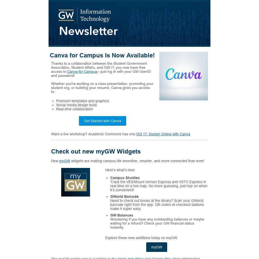 Thanks to a collaboration between the Student Government Association, Student Affairs, and GW IT, you now have free access to Canva for Campus—just log in with your GW UserID and password!