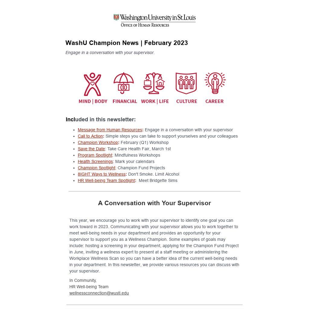 This year, we encourage you to work with your supervisor to identify one goal you can work toward in 2023. Communicating with your supervisor allows you to work together to meet well-being needs in your department and provides an opportunity for your supervisor to support you as a Wellness Champion. Some examples of goals may include: hosting a screening in your department, applying for the Champion Fund Project in June, inviting a wellness expert to present at a staff meeting or administering the Workplace Wellness Scan so you can have a better idea of the current well-being needs in your department. In this newsletter, we provide various resources you can discuss with your supervisor.