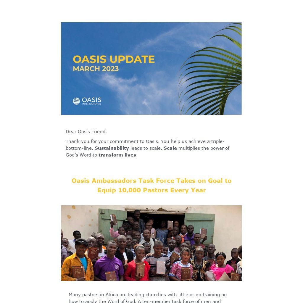 Thank you for your commitment to Oasis. You help us achieve a triple-bottom-line. Sustainability leads to scale. Scale multiplies the power of God’s Word to transform lives.