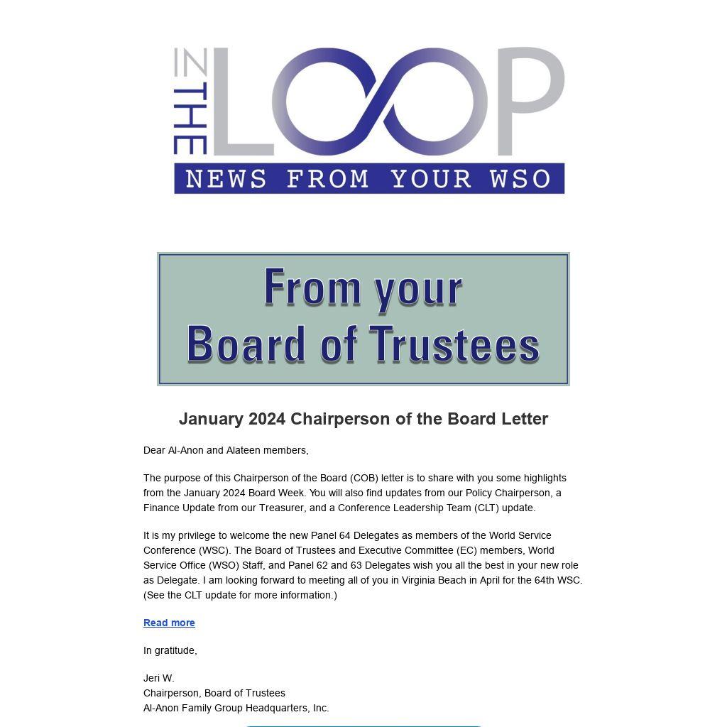 The purpose of this Chairperson of the Board (COB) letter is to share with you some highlights from the January 2024 Board Week. You will also find updates from our Policy Chairperson, a Finance Update from our Treasurer, and a Conference Leadership Team (CLT) update.