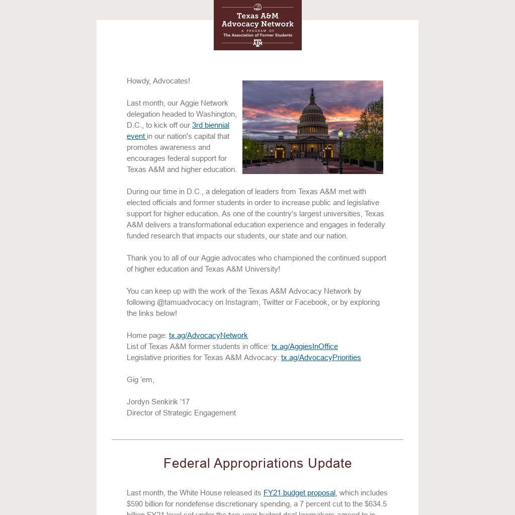 FY21 budget proposal, which includes $590 billion for nondefense discretionary spending, a 7 percent cut to the $634.5 billion FY21 level set under the two-year budget deal lawmakers agreed to in August 2019. While the proposed budget does include some positive components, chief among those being $300M for a new National Security Multi-mission Vessel (NSMV) for our Maritime Academy at Texas A&M-Galveston, in addition to critical areas of research such as artificial intelligence and space technology, it also contains funding cuts critical to advancing research at Texas A&M. In particular, a nearly $600M decrease (-6.5%) in funding to the National Science Foundation and a $3B decrease (-7%) to the National Institutes of Health.