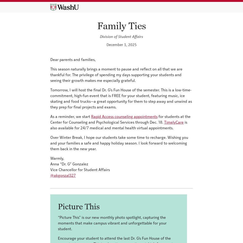 Tomorrow, I will host the final Dr. G’s Fun House of the semester. This is a low-time-commitment, high-fun event that is FREE for your student, featuring music, ice skating and food trucks—a great opportunity for them to step away and unwind as they prep for final projects and exams.