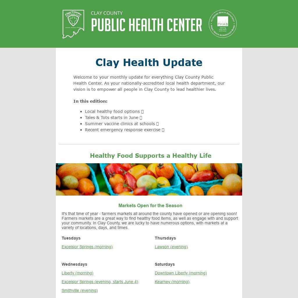 Welcome to your monthly update for everything Clay County Public Health Center. As your nationally-accredited local health department, our vision is to empower all people in Clay County to lead healthier lives.
