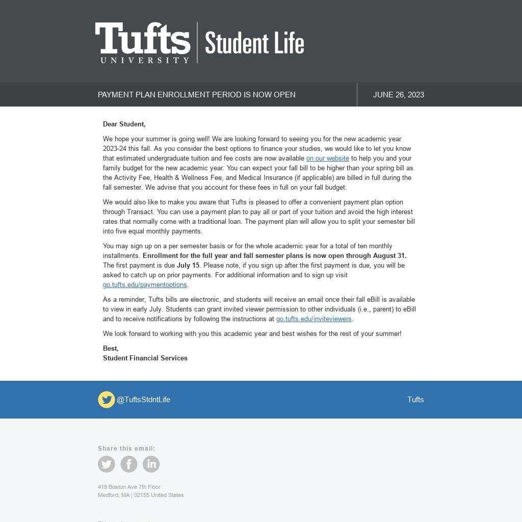 We would also like to make you aware that Tufts is pleased to offer a convenient payment plan option through Transact. You can use a payment plan to pay all or part of your tuition and avoid the high interest rates that normally come with a traditional loan. The payment plan will allow you to split your semester bill into five equal monthly payments.