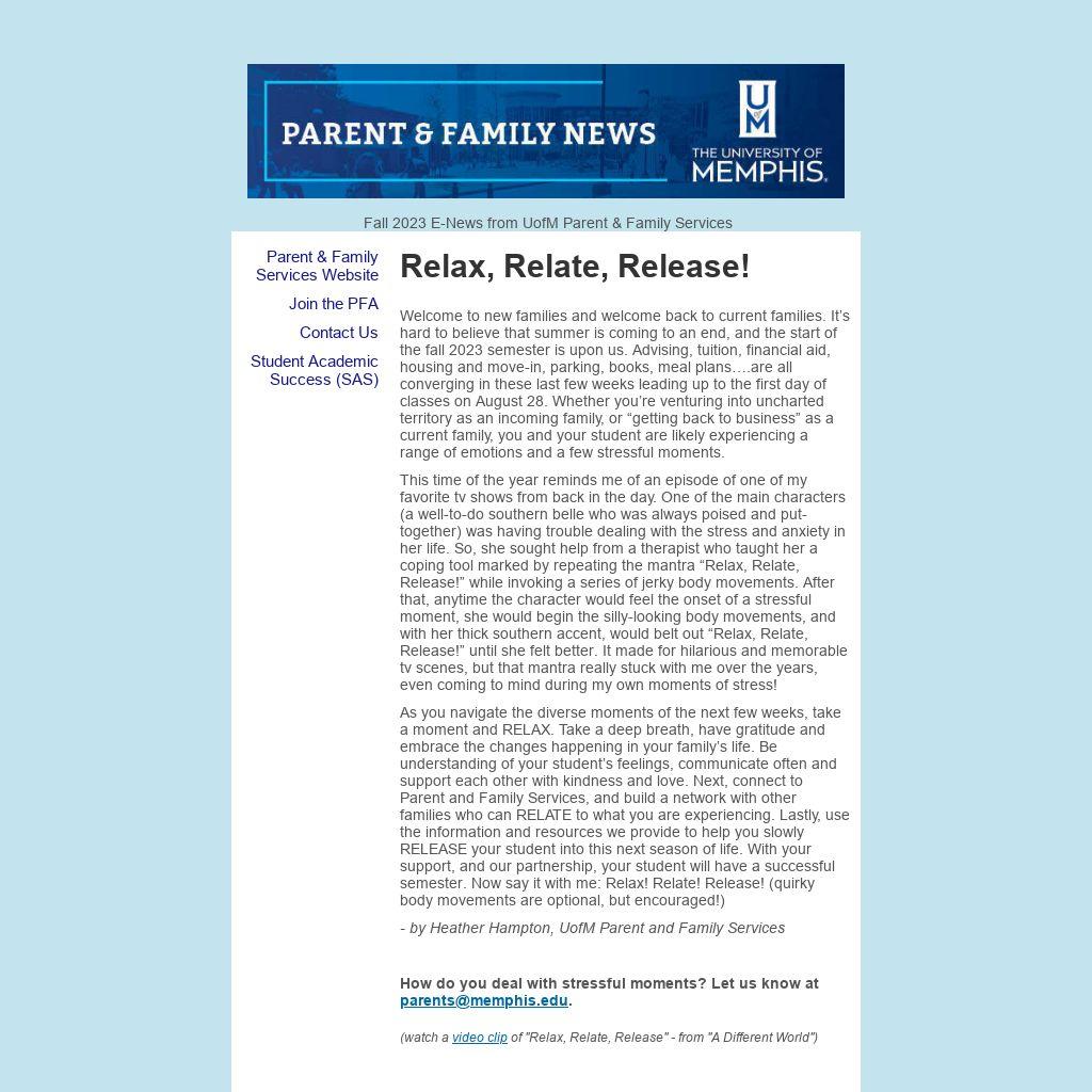 As you navigate the diverse moments of the next few weeks, take a moment and RELAX. Take a deep breath, have gratitude and embrace the changes happening in your family’s life. Be understanding of your student’s feelings, communicate often and support each other with kindness and love. Next, connect to Parent and Family Services, and build a network with other families who can RELATE to what you are experiencing. Lastly, use the information and resources we provide to help you slowly RELEASE your student into this next season of life. With your support, and our partnership, your student will have a successful semester. Now say it with me: Relax! Relate! Release! (quirky body movements are optional, but encouraged!)