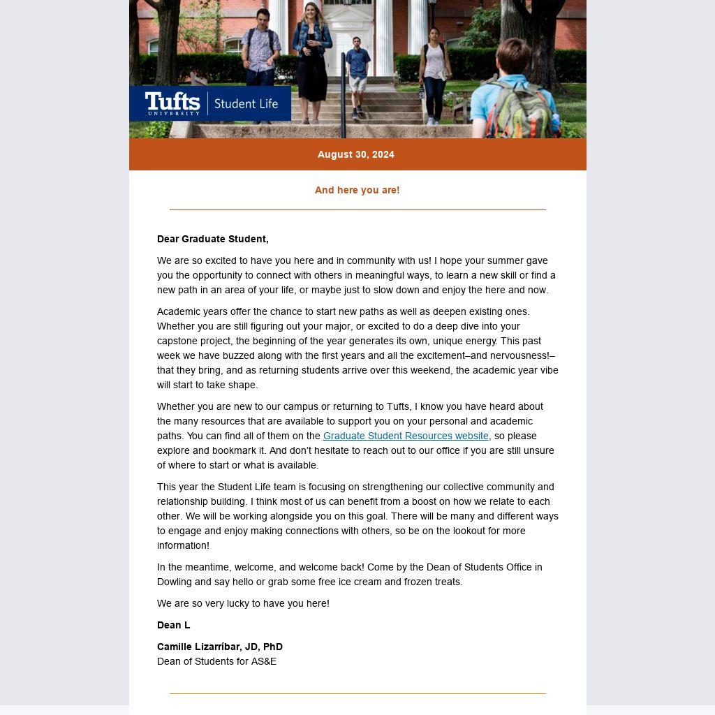 Whether you are new to our campus or returning to Tufts, I know you have heard about the many resources that are available to support you on your personal and academic paths. You can find all of them on the Graduate Student Resources website, so please explore and bookmark it. And don’t hesitate to reach out to our office if you are still unsure of where to start or what is available.