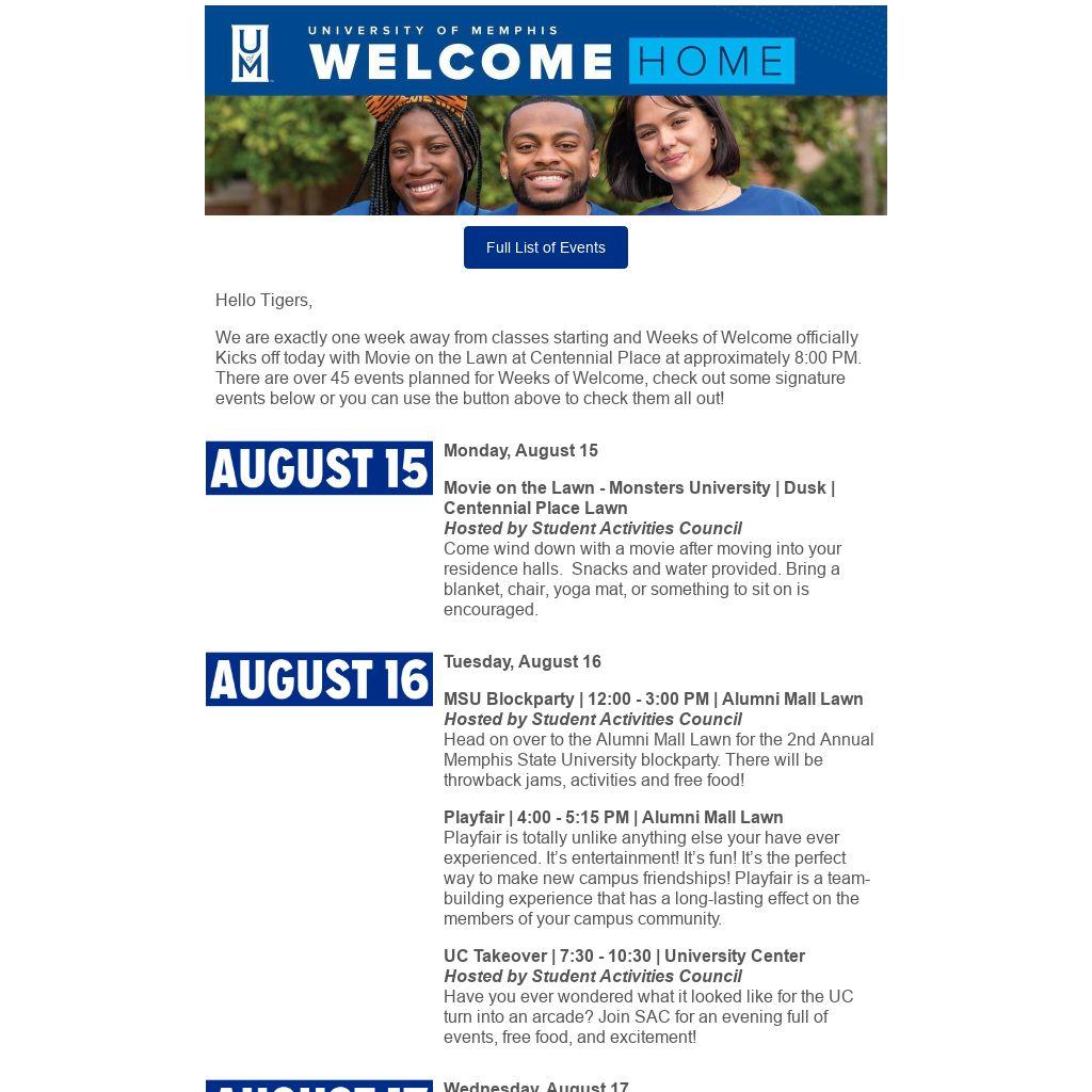 We are exactly one week away from classes starting and Weeks of Welcome officially Kicks off today with Movie on the Lawn at Centennial Place at approximately 8:00 PM. There are over 45 events planned for Weeks of Welcome, check out some signature events below or you can use the button above to check them all out!