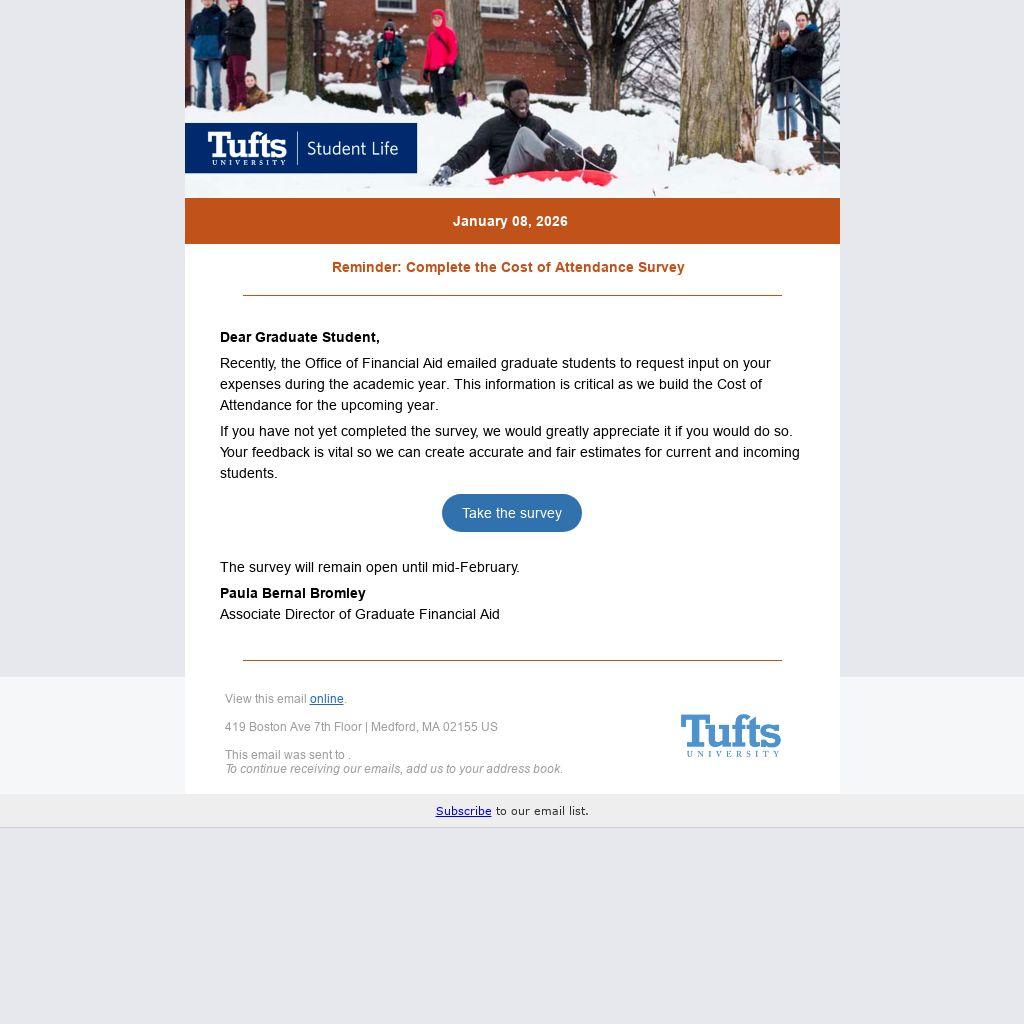 Recently, the Office of Financial Aid emailed graduate students to request input on your expenses during the academic year. This information is critical as we build the Cost of Attendance for the upcoming year.