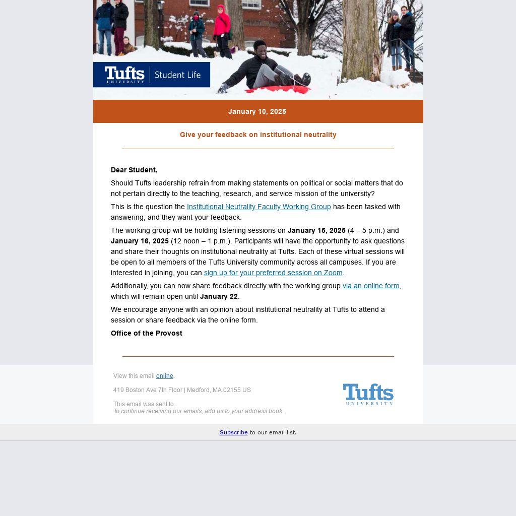 The working group will be holding listening sessions on January 15, 2025 (4 – 5 p.m.) and January 16, 2025 (12 noon – 1 p.m.). Participants will have the opportunity to ask questions and share their thoughts on institutional neutrality at Tufts. Each of these virtual sessions will be open to all members of the Tufts University community across all campuses. If you are interested in joining, you can sign up for your preferred session on Zoom.