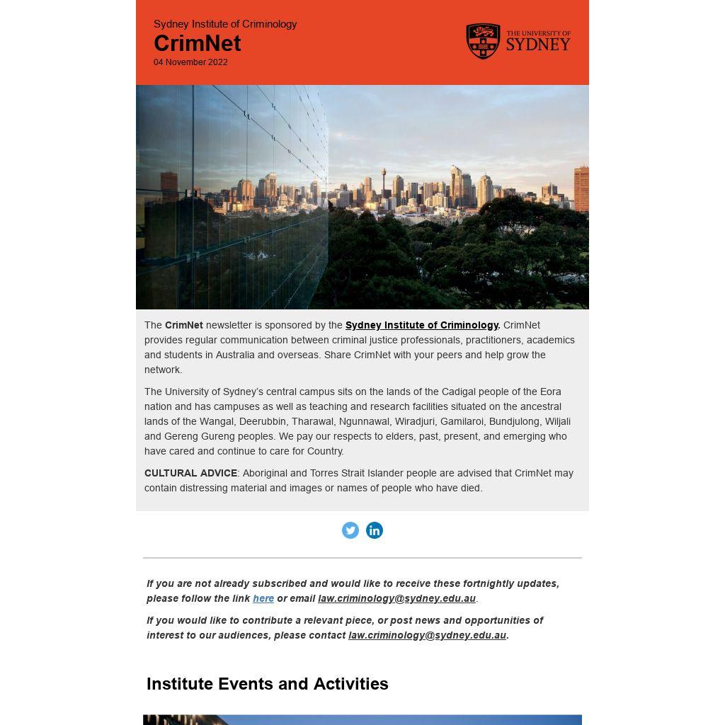The CrimNet newsletter is sponsored by the Sydney Institute of Criminology. CrimNet provides regular communication between criminal justice professionals, practitioners, academics and students in Australia and overseas. Share CrimNet with your peers and help grow the network.
