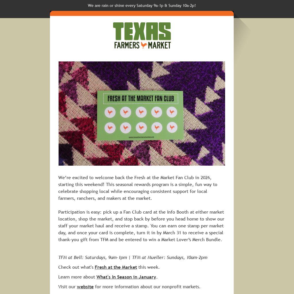 We’re excited to welcome back the Fresh at the Market Fan Club in 2026, starting this weekend! This seasonal rewards program is a simple, fun way to celebrate shopping local while encouraging consistent support for local farmers, ranchers, and makers at the market.