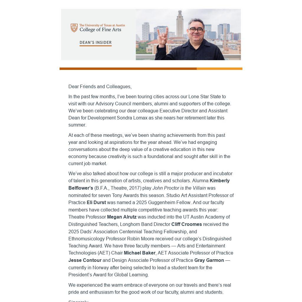 We’ve also talked about how our college is still a major producer and incubator of talent in this generation of artists, creatives and scholars. Alumna Kimberly Belflower’s (B.F.A., Theatre, 2017) play John Proctor is the Villain was nominated for seven Tony Awards this season. Studio Art Assistant Professor of Practice Eli Durst was named a 2025 Guggenheim Fellow. And our faculty members have collected multiple competitive teaching awards this year: Theatre Professor Megan Alrutz was inducted into the UT Austin Academy of Distinguished Teachers, Longhorn Band Director Cliff Croomes received the 2025 Dads’ Association Centennial Teaching Fellowship, and Ethnomusicology Professor Robin Moore received our college’s Distinguished Teaching Award. We have three faculty members — Arts and Entertainment Technologies (AET) Chair Michael Baker, AET Associate Professor of Practice Jesse Contour and Design Associate Professor of Practice Gray Garmon — currently in Norway after being selected to lead a student team for the President’s Award for Global Learning.