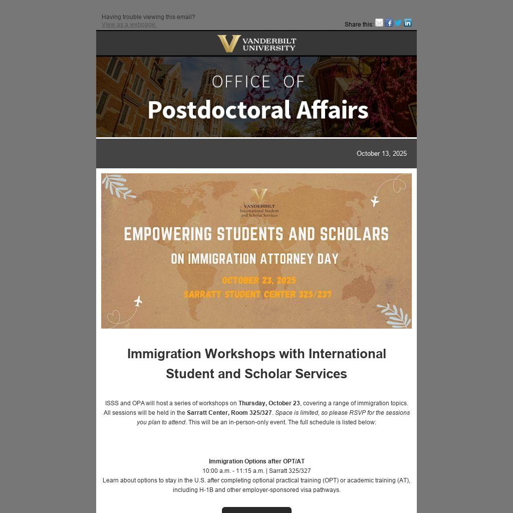 ISSS and OPA will host a series of workshops on Thursday, October 23, covering a range of immigration topics. All sessions will be held in the Sarratt Center, Room 325/327. Space is limited, so please RSVP for the sessions you plan to attend. This will be an in-person-only event. The full schedule is listed below:
