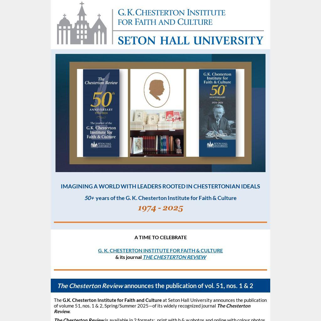 The G.K. Chesterton Institute for Faith and Culture at Seton Hall University announces the publication of volume 51, nos. 1 & 2, Spring/Summer 2025—of its widely recognized journal The Chesterton Review.