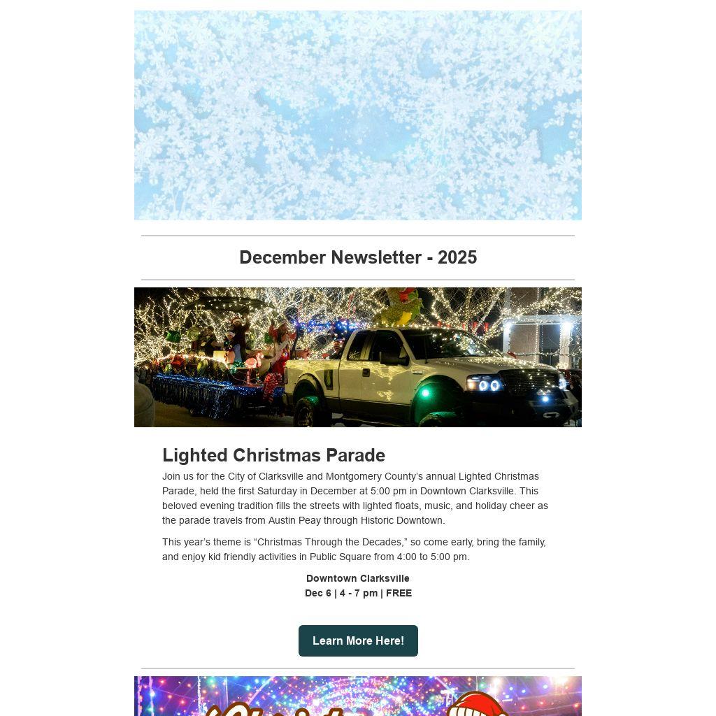 Lighted Christmas ParadeJoin us for the City of Clarksville and Montgomery County’s annual Lighted Christmas Parade, held the first Saturday in December at 5:00 pm in Downtown Clarksville. This beloved evening tradition fills the streets with lighted floats, music, and holiday cheer as the parade travels from Austin Peay through Historic Downtown.