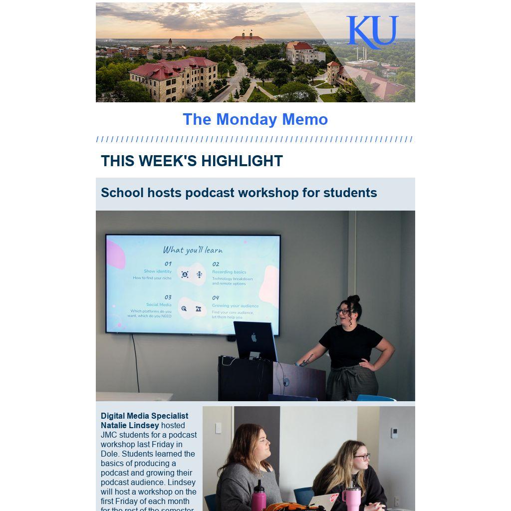 Digital Media Specialist Natalie Lindsey hosted JMC students for a podcast workshop last Friday in Dole. Students learned the basics of producing a podcast and growing their podcast audience. Lindsey will host a workshop on the first Friday of each month for the rest of the semester for JMC students interested in learning more about podcasting.