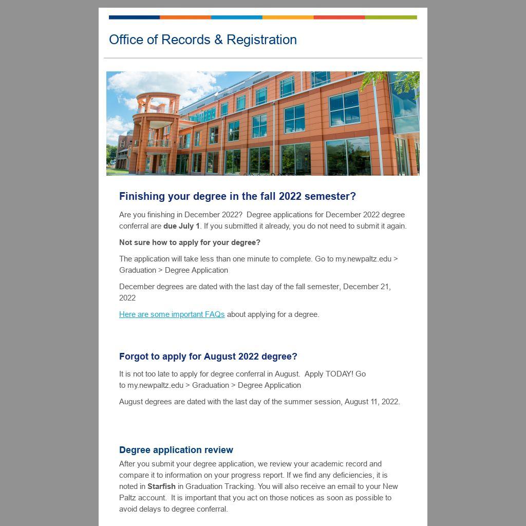 Are you finishing in December 2022? Degree applications for December 2022 degree conferral are due July 1. If you submitted it already, you do not need to submit it again.