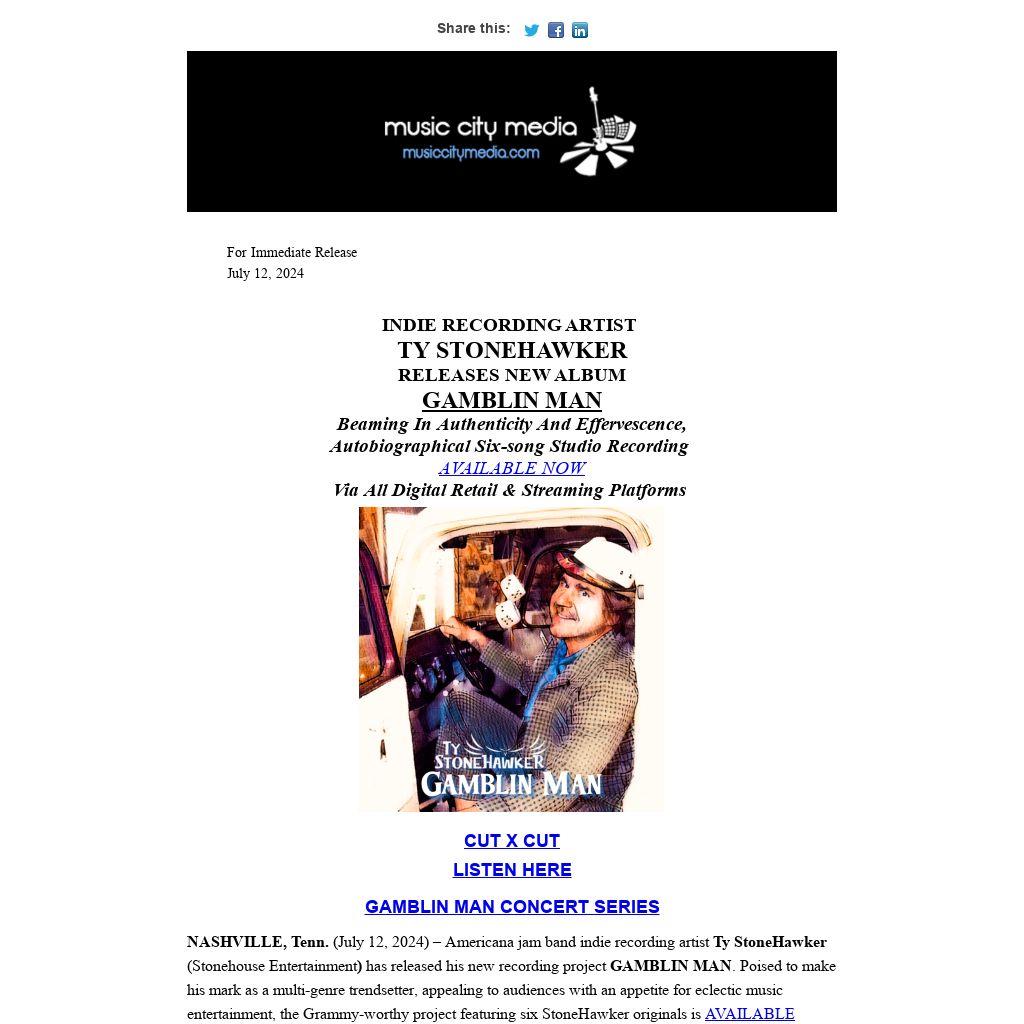 NASHVILLE, Tenn. (July 12, 2024) – Americana jam band indie recording artist Ty StoneHawker (Stonehouse Entertainment) has released his new recording project GAMBLIN MAN. Poised to make his mark as a multi-genre trendsetter, appealing to audiences with an appetite for eclectic music entertainment, the Grammy-worthy project featuring six StoneHawker originals is AVAILABLE NOW via all major digital retail and streaming platforms.