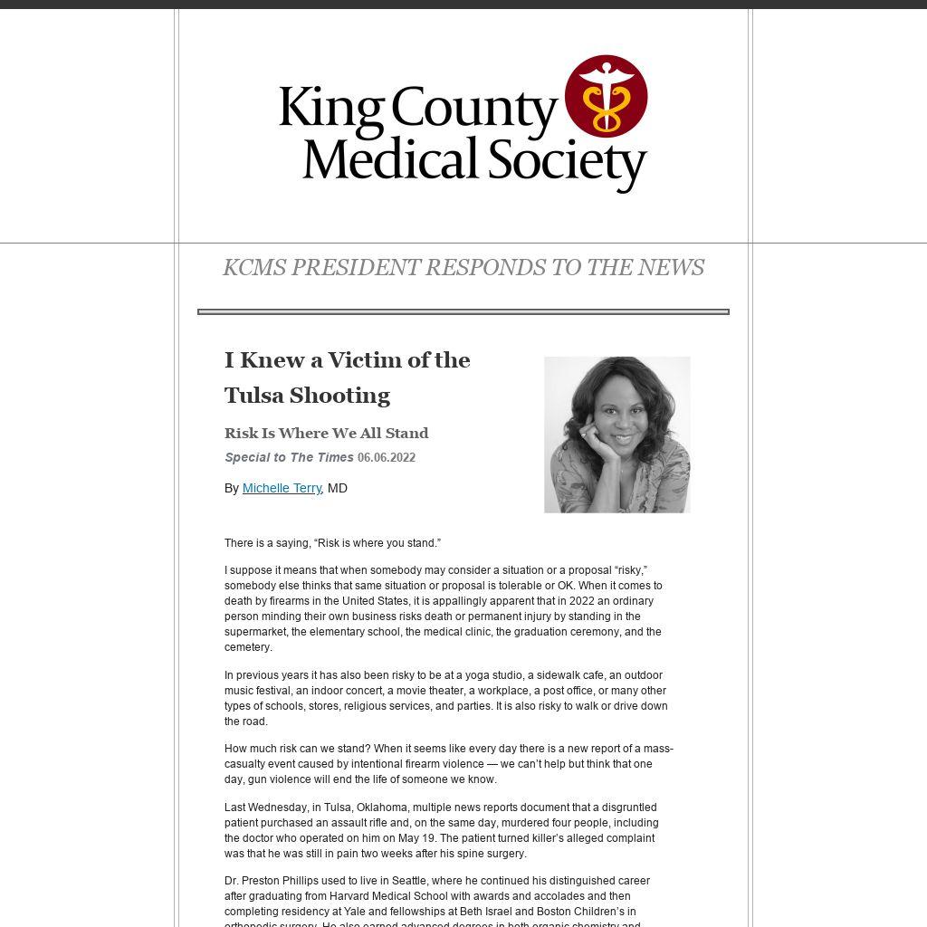 Michelle Terry, MD is a pediatrician in Seattle and the King County Medical Society president.