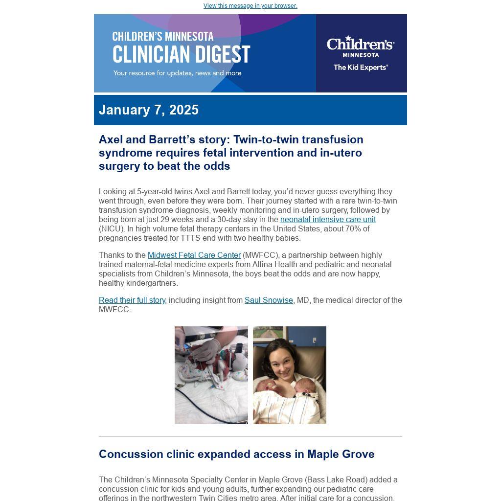 If you find this newsletter valuable, we invite you to send this email to your colleagues so that they can learn about what's happening at Children's Minnesota. If this email was forwarded to you, we encourage you to sign up for the Children's Minnesota Clinician Digest.