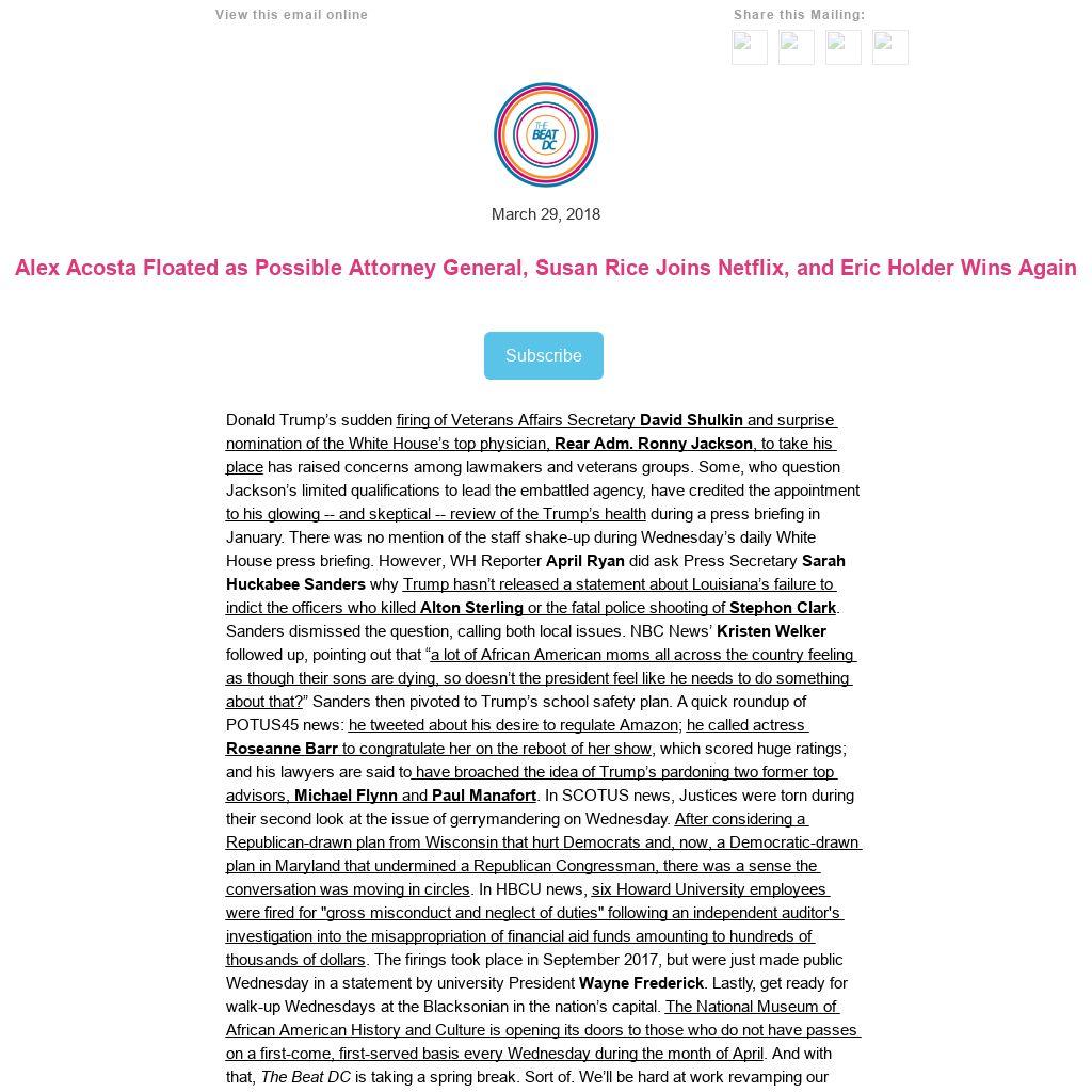 Donald Trump’s sudden firing of Veterans Affairs Secretary David Shulkin and surprise nomination of the White House’s top physician, Rear Adm. Ronny Jackson, to take his place has raised concerns among lawmakers and veterans groups. Some, who question Jackson’s limited qualifications to lead the embattled agency, have credited the appointment to his glowing -- and skeptical -- review of the Trump’s health during a press briefing in January. There was no mention of the staff shake-up during Wednesday’s daily White House press briefing. However, WH Reporter April Ryan did ask Press Secretary Sarah Huckabee Sanders why Trump hasn’t released a statement about Louisiana’s failure to indict the officers who killed Alton Sterling or the fatal police shooting of Stephon Clark. Sanders dismissed the question, calling both local issues. NBC News’ Kristen Welker followed up, pointing out that “a lot of African American moms all across the country feeling as though their sons are dying, so doesn’t the president feel like he needs to do something about that?” Sanders then pivoted to Trump’s school safety plan. A quick roundup of POTUS45 news: he tweeted about his desire to regulate Amazon; he called actress Roseanne Barr to congratulate her on the reboot of her show, which scored huge ratings; and his lawyers are said to have broached the idea of Trump’s pardoning two former top advisors, Michael Flynn and Paul Manafort. In SCOTUS news, Justices were torn during their second look at the issue of gerrymandering on Wednesday. After considering a Republican-drawn plan from Wisconsin that hurt Democrats and, now, a Democratic-drawn plan in Maryland that undermined a Republican Congressman, there was a sense the conversation was moving in circles. In HBCU news, six Howard University employees were fired for "gross misconduct and neglect of duties" following an independent auditor's investigation into the misappropriation of financial aid funds amounting to hundreds of thousands of dollars. The firings took place in September 2017, but were just made public Wednesday in a statement by university President Wayne Frederick. Lastly, get ready for walk-up Wednesdays at the Blacksonian in the nation’s capital. The National Museum of African American History and Culture is opening its doors to those who do not have passes on a first-come, first-served basis every Wednesday during the month of April. And with that, The Beat DC is taking a spring break. Sort of. We’ll be hard at work revamping our website, bringing on new staff, and getting ready to embark on our second round of financing. So we’ll have lots of news when we return on Monday, April 9th. Until then, we’re leaving you with all this...