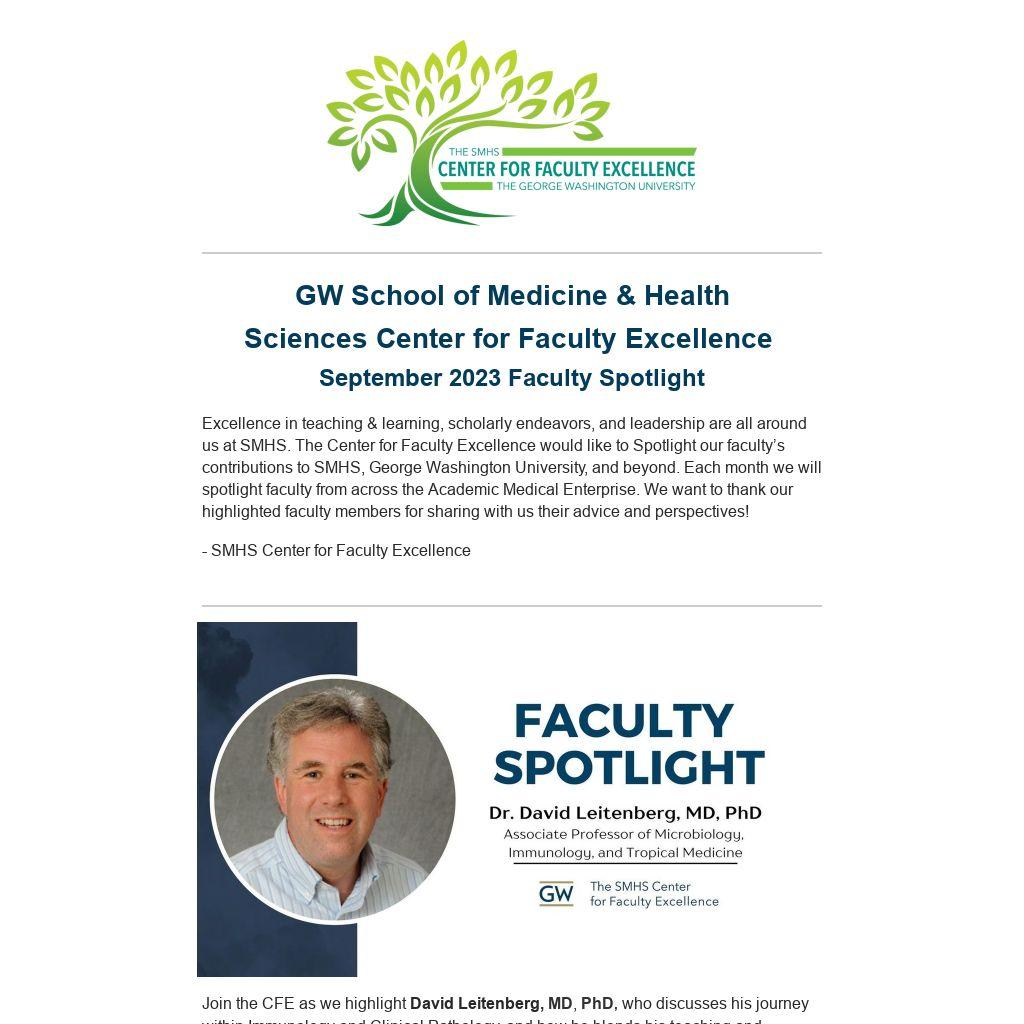Excellence in teaching & learning, scholarly endeavors, and leadership are all around us at SMHS. The Center for Faculty Excellence would like to Spotlight our faculty’s contributions to SMHS, George Washington University, and beyond. Each month we will spotlight faculty from across the Academic Medical Enterprise. We want to thank our highlighted faculty members for sharing with us their advice and perspectives!