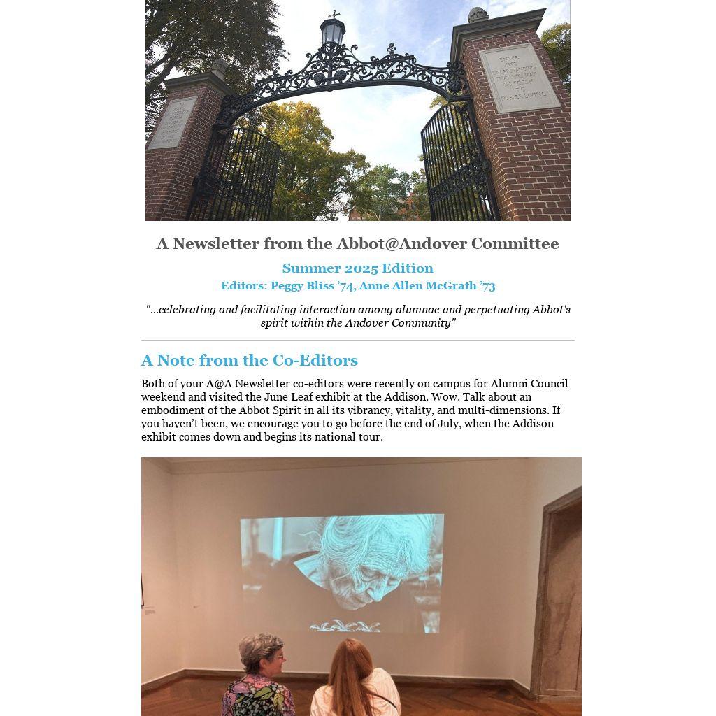 Our goal is to make this newsletter relevant and engaging to all who care about Abbot’s legacy at Andover. If you have story ideas, questions, or suggestions of any kind, we encourage you to reach out to us. Please share what you know or would like to know.