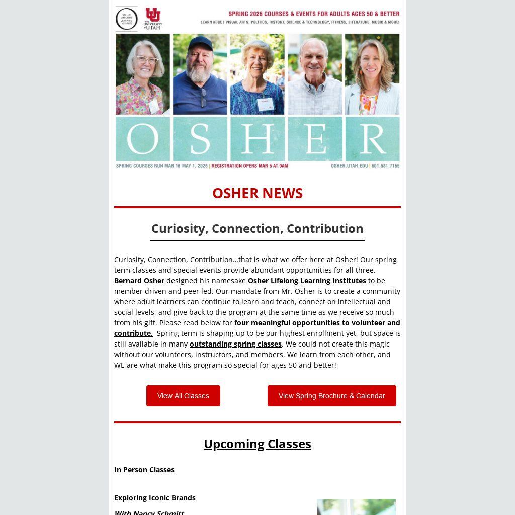 Curiosity, Connection, Contribution…that is what we offer here at Osher! Our spring term classes and special events provide abundant opportunities for all three. Bernard Osher designed his namesake Osher Lifelong Learning Institutes to be member driven and peer led. Our mandate from Mr. Osher is to create a community where adult learners can continue to learn and teach, connect on intellectual and social levels, and give back to the program at the same time as we receive so much from his gift. Please read below for four meaningful opportunities to volunteer and contribute. Spring term is shaping up to be our highest enrollment yet, but space is still available in many outstanding spring classes. We could not create this magic without our volunteers, instructors, and members. We learn from each other, and WE are what make this program so special for ages 50 and better!