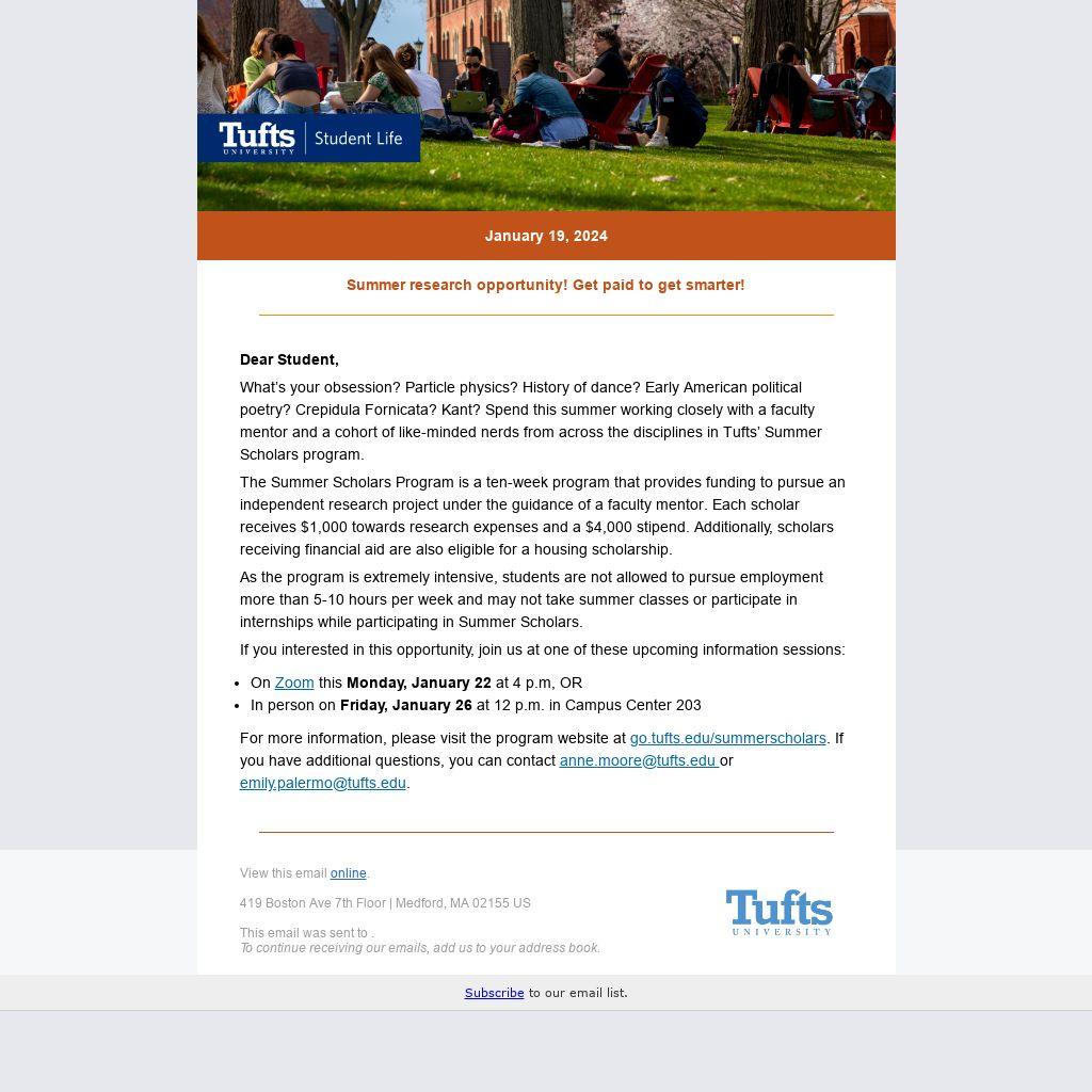 What’s your obsession? Particle physics? History of dance? Early American political poetry? Crepidula Fornicata? Kant? Spend this summer working closely with a faculty mentor and a cohort of like-minded nerds from across the disciplines in Tufts’ Summer Scholars program.