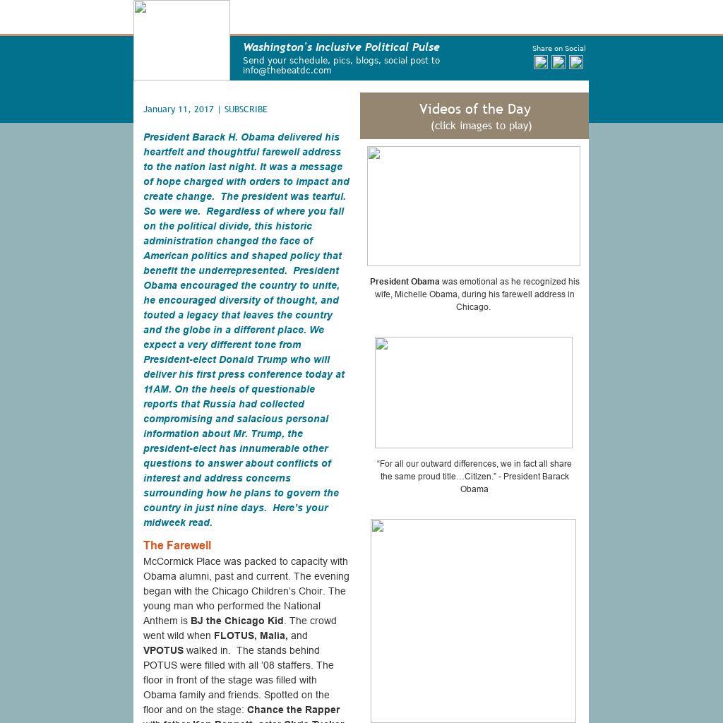 President Barack H. Obama delivered his heartfelt and thoughtful farewell address to the nation last night. It was a message of hope charged with orders to impact and create change. The president was tearful. So were we. Regardless of where you fall on the political divide, this historic administration changed the face of American politics and shaped policy that benefit the underrepresented. President Obama encouraged the country to unite, he encouraged diversity of thought, and touted a legacy that leaves the country and the globe in a different place. We expect a very different tone from President-elect Donald Trump who will deliver his first press conference today at 11AM. On the heels of questionable reports that Russia had collected compromising and salacious personal information about Mr. Trump, the president-elect has innumerable other questions to answer about conflicts of interest and address concerns surrounding how he plans to govern the country in just nine days. Here’s your midweek read.