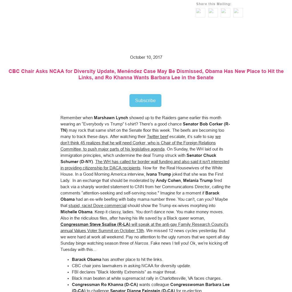 Remember when Marshawn Lynch showed up to the Raiders game earlier this month wearing an “Everybody vs Trump” t-shirt? There’s a good chance Senator Bob Corker (R-TN) may rock that same shirt on the Senate floor this week. The beefs are becoming too many to track these days. After watching their Twitter beef escalate, it’s safe to say we don’t think 45 realizes that he will need Corker, who is Chair of the Foreign Relations Committee, to push major parts of his legislative agenda. On Sunday, the WH laid out its immigration principles, which undermine the deal Trump struck with Senator Chuck Schumer (D-NY). The WH has called for border wall funding and also said it isn't interested in providing citizenship for DACA recipients. Now for the Real Housewives of the White House. In a Good Morning America interview, Ivana Trump joked that she was the First Lady. In an exchange that should be moderated by Andy Cohen, Melania Trump fired back via a sharply worded statement to CNN from her Communications Director, calling the comments “attention-seeking and self-serving noise." Imagine for a moment if Barack Obama had an ex-wife beefing with baby mama number three. You can’t, can you? Maybe that stupid, racist Dove commercial should show the Trump ex-wives morphing into Michelle Obama. Keep it classy, ladies. You don’t dance now. You make money moves. Also in the ridiculous files, after having his life saved by a Black queer woman, Congressman Steve Scalise (R-LA) will speak at the anti-gay Family Research Council’s annual Values Voter Summit on October 13th. We missed 12 news cycles yesterday. But we were hard at work all weekend. Pay no attention to the ugly rumors that we spent all day Sunday binge watching season three of Narcos. Fake news I tell you! Ok, we’re kicking off Tuesday with this...