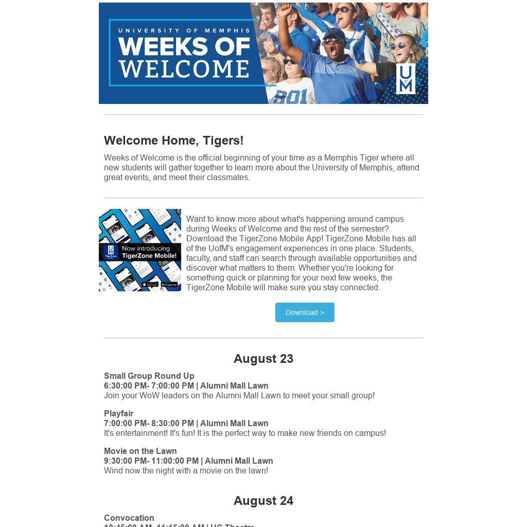 Weeks of Welcome is the official beginning of your time as a Memphis Tiger where all new students will gather together to learn more about the University of Memphis, attend great events, and meet their classmates.