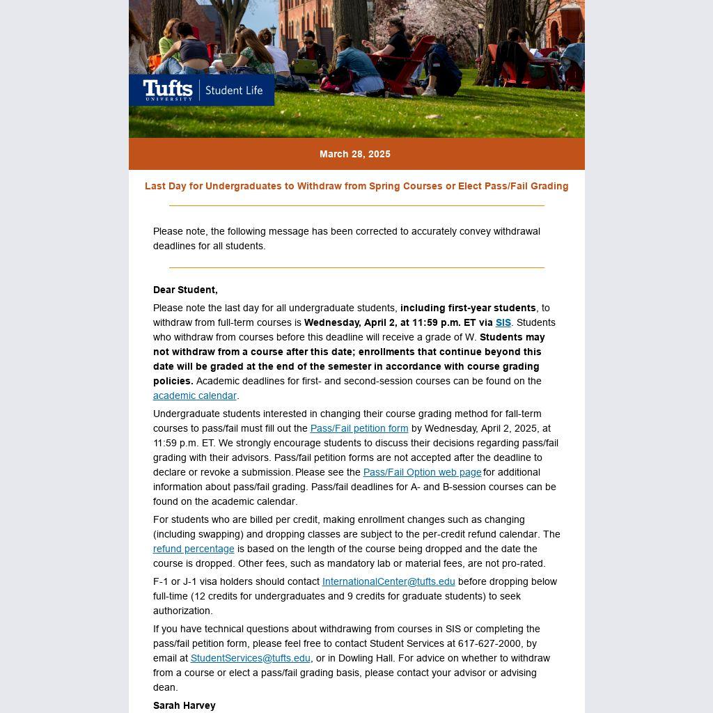 If you have technical questions about withdrawing from courses in SIS or completing the pass/fail petition form, please feel free to contact Student Services at 617-627-2000, by email at StudentServices@tufts.edu, or in Dowling Hall. For advice on whether to withdraw from a course or elect a pass/fail grading basis, please contact your advisor or advising dean.