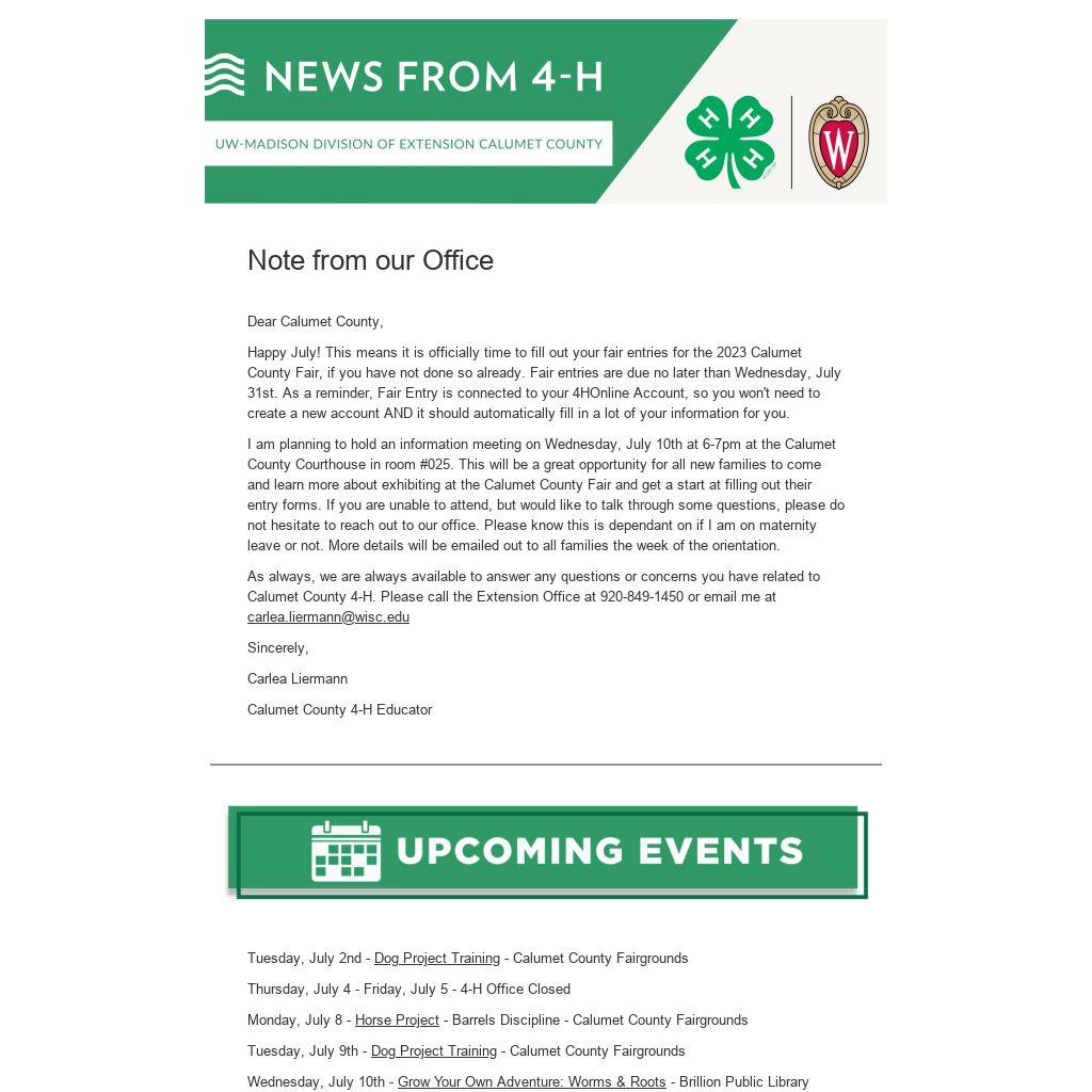 As always, we are always available to answer any questions or concerns you have related to Calumet County 4-H. Please call the Extension Office at 920-849-1450 or email me at carlea.liermann@wisc.edu