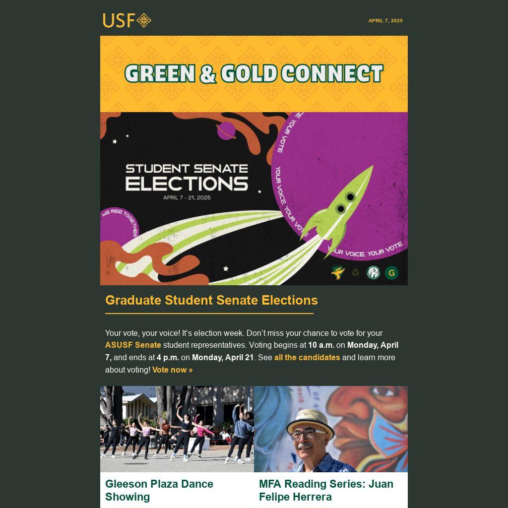 Your vote, your voice! It’s election week. Don’t miss your chance to vote for your ASUSF Senate student representatives. Voting begins at 10 a.m. on Monday, April 7, and ends at 4 p.m. on Monday, April 21. See all the candidates and learn more about voting! Vote now »