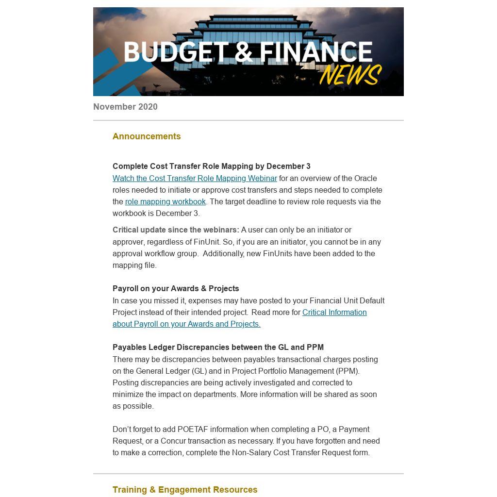 There may be discrepancies between payables transactional charges posting on the General Ledger (GL) and in Project Portfolio Management (PPM). Posting discrepancies are being actively investigated and corrected to minimize the impact on departments. More information will be shared as soon as possible.