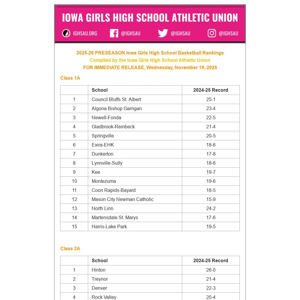 2025-26 PRESEASON Iowa Girls High School Basketball Rankings