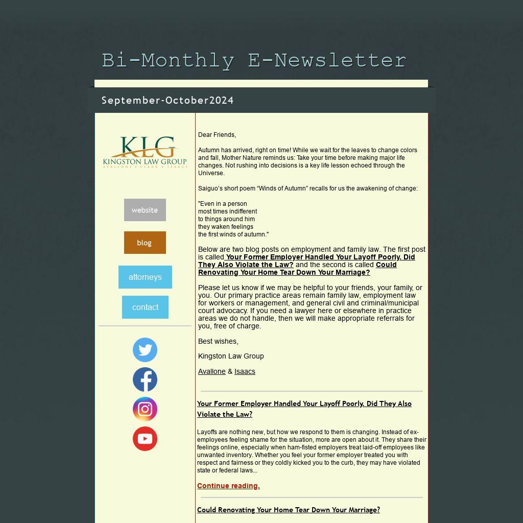 Dear Friends, Autumn has arrived, right on time! While we wait for the leaves to change colors and fall, Mother Nature reminds us: Take your time before making major life changes. Not rushing into decisions is a key life lesson echoed through the Universe. Saiguo’s short poem “Winds of Autumn” recalls for us the awakening of change: "Even in a person most times indifferent to things around him they waken feelings the first winds of autumn." Below are two blog posts on employment and family law. The first post is called Your Former Employer Handled Your Layoff Poorly. Did They Also Violate the Law? and the second is called Could Renovating Your Home Tear Down Your Marriage?